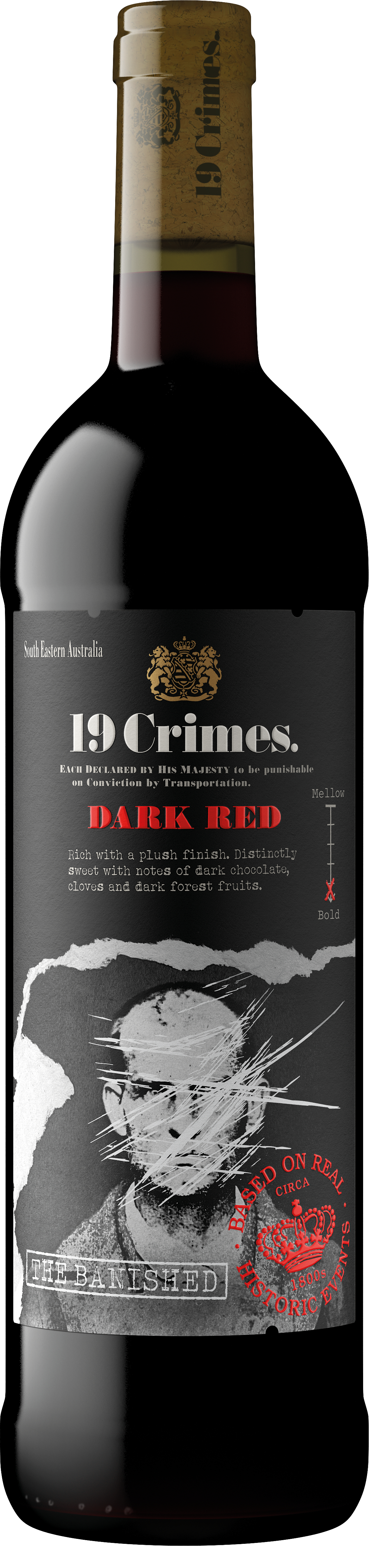 Die Banished Non-Vintage von 19 Crimes präsentiert einen facettenreichen Rotwein, der mit einer harmonischen Süße überzeugt. Aromen von dunkler Schokolade und Vanille verbinden sich mit einer Prise Zimt und Nelke, die den Geschmack bereichern. Am Gaumen entfalten sich dunkle Waldfrüchte, während der sanfte Abgang einen bleibenden Eindruck hinterlässt. Der Wein verfügt über einen einzigartigen Charakter, der auf britische Straftäter des 18. Jahrhunderts zurückgeht, die nach Australien deportiert wurden.