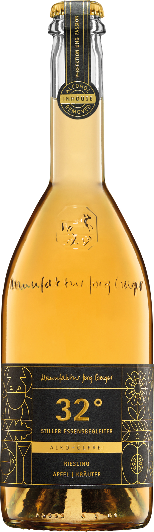 Der Bio Rieslingwein wird nach der Entalkoholisierung mit Apfel, Quitte und Pfirsich kombiniert. Zur Interpretation des charakteristischen Dufts werden die Blüten von Orange, Akazie und Holunder verwendet. Zitronenverbene verstärkt die Rebsortentypizität, ergänzt durch dezente Noten vom Fenchelgrün.